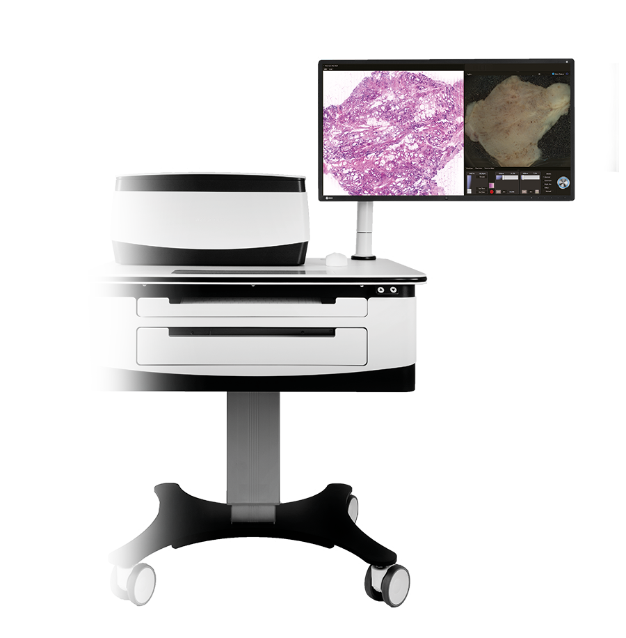 High resolution images of unfixed tissue without sectioning. Within 5 minutes, digital and on the bedside. The device’s software uses an algorithm to translate the acquired image information into colors that resemble H&E.